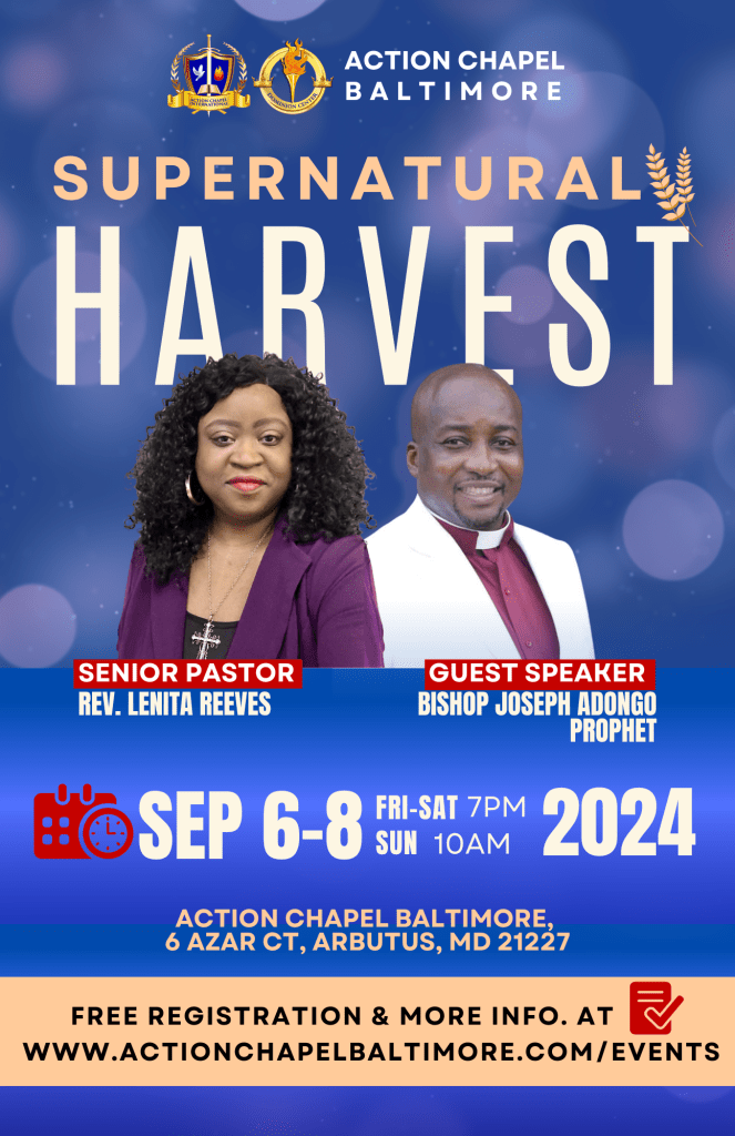 Join Action Chapel Baltimore and Rev. Lenita Reeves, Sr. Pastor, for a weekend with Bishop Joseph Adongo, a prophet of the Lord and overseer of Prosperity City Chapel International. Services will be Friday and Saturday, Sept. 6th and 7th, at 7pm and Sunday morning, Sept. 8th at 10am. CLICK HERE FOR FREE REGISTRATION AND TO INDICATE CLERGY SEATING.