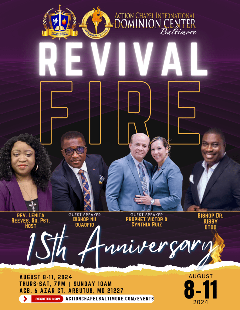 Join Action Chapel Baltimore and Rev. Lenita Reeves, Sr. Pastor, as we celebrate 15 years of God’s faithfulness with Apostle Victor Ruiz, whose ministry is marked with tangible miracles and accurate prophecies, and Bishop Nii Quaofio, senior pastor of Action Worship Center Dansoman, a revivalist with apostolic grace full of the fire of God.
