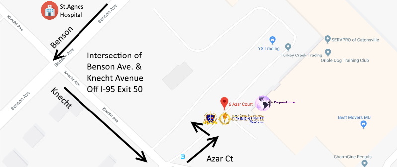 We are located at 6 Azar Court, Arbutus, MD 21227 in Benson Business Center off of Knecht Avenue. When you enter the business center, turn left to go up the hill and 6 Azar will be the first unit on your right.